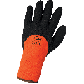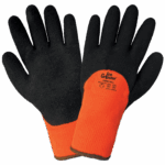 These high-visibility, low-temperature gloves feature an orange brushed acrylic terry cloth 10-gauge shell with a heavy nap and soft brushed interior. The palm of the glove is three-quarter dipped with a foam rubber coating that insulates from cold, repels water, and provides grip in chilly conditions. Features a knit wrist for added comfort and warmth.